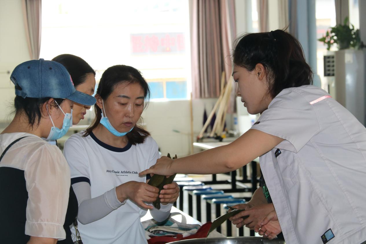 绿杨带雨垂垂重,五色新丝缠角粽。活动现场,大家捋粽叶,填糯米,包裹缠线,一个个有棱有角的粽子活灵活现。大家边包粽子,边分享交流技巧,整个活动现场洋溢着欢声笑语,其乐融融。